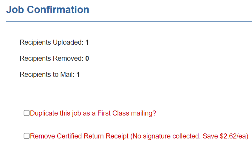April 13, 2025 First-Class Copy of Certified Mail You can duplicate your Certified letter as a First-Class letter to avoid loading two separate jobs. Simply build your Certified Mail job first and then, on the Job Approval page, click the box to duplicate your job as First-Class. No results found