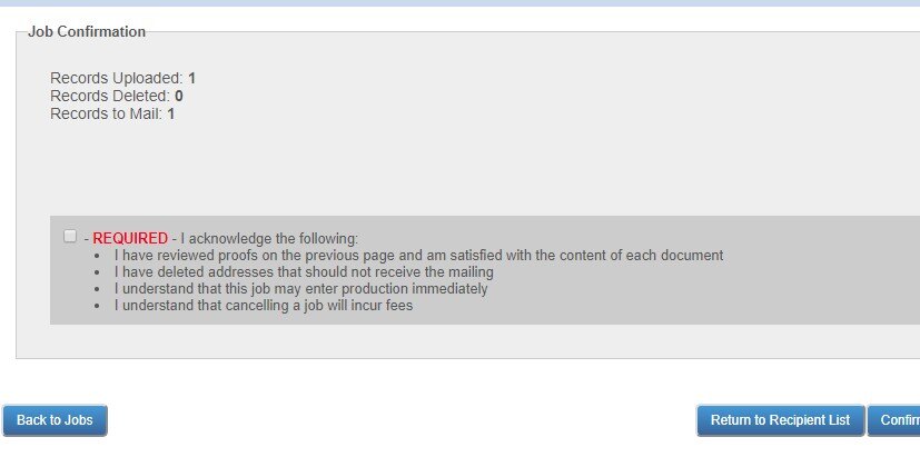 Additionally, we remind you prior to the check out process that a proof should be reviewed, unwanted addresses should be deleted, the job may enter production immediately, and that cancelling a job will incur fees.