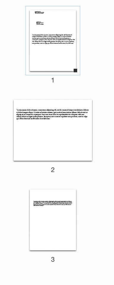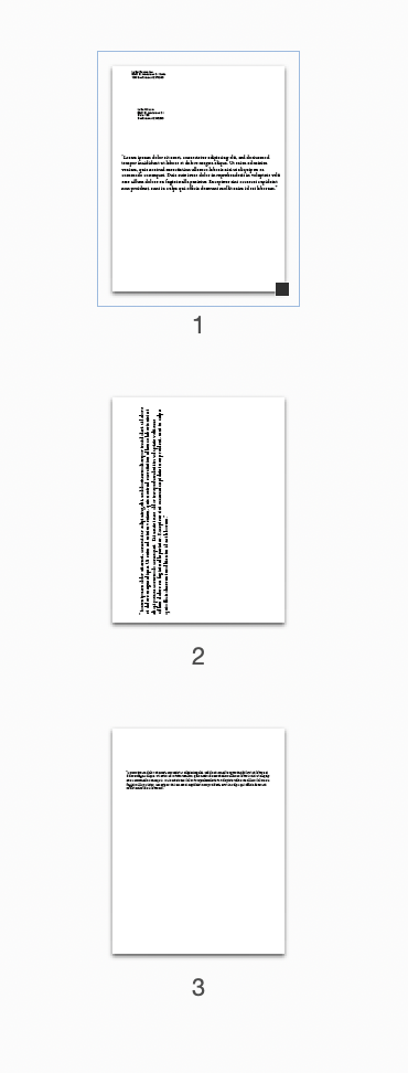 With that in mind, if you need one or more of the pages within a document to be printed as landscape, you'll need to manually rotate the entire page within the PDF file prior to uploading it to our website. For example, let's say you have a three-page file and one page is landscape, as shown in this example: