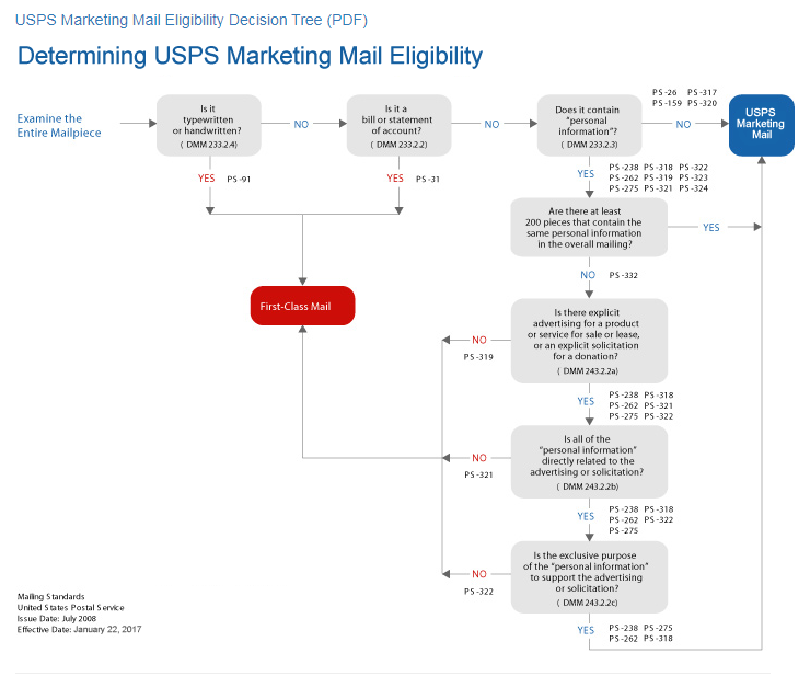The USPS put together this helpful article and decision tree to assist in determining if your mail is eligible to be sent as First-Class or Marketing mail.