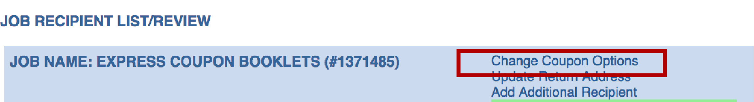 On the screen within your LetterStream account called "Job Recipient List/Review", you will see a few option at the top, above the recipients. One of those options says "Change Coupon Options". It looks like this: