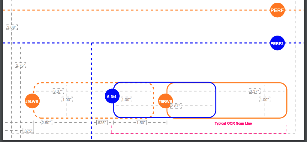 At the bottom of the document you'll see additional information. The orange dashed PERF line represents the placement of the perforated line on our 2/3 perforated paper stock, while the blue dashed lines represents the placement of the perforated lines on our 6 3/4 perforated paper stock.