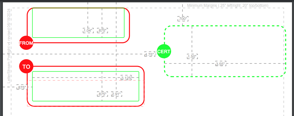 The green CERT box just to the right of the address sections is the space that needs to be left clear, but only if you're sending certified mail. This is where our system will add the certified mail barcode and tracking number. If sending non-certified mail, this space can be used to include any document information or details.