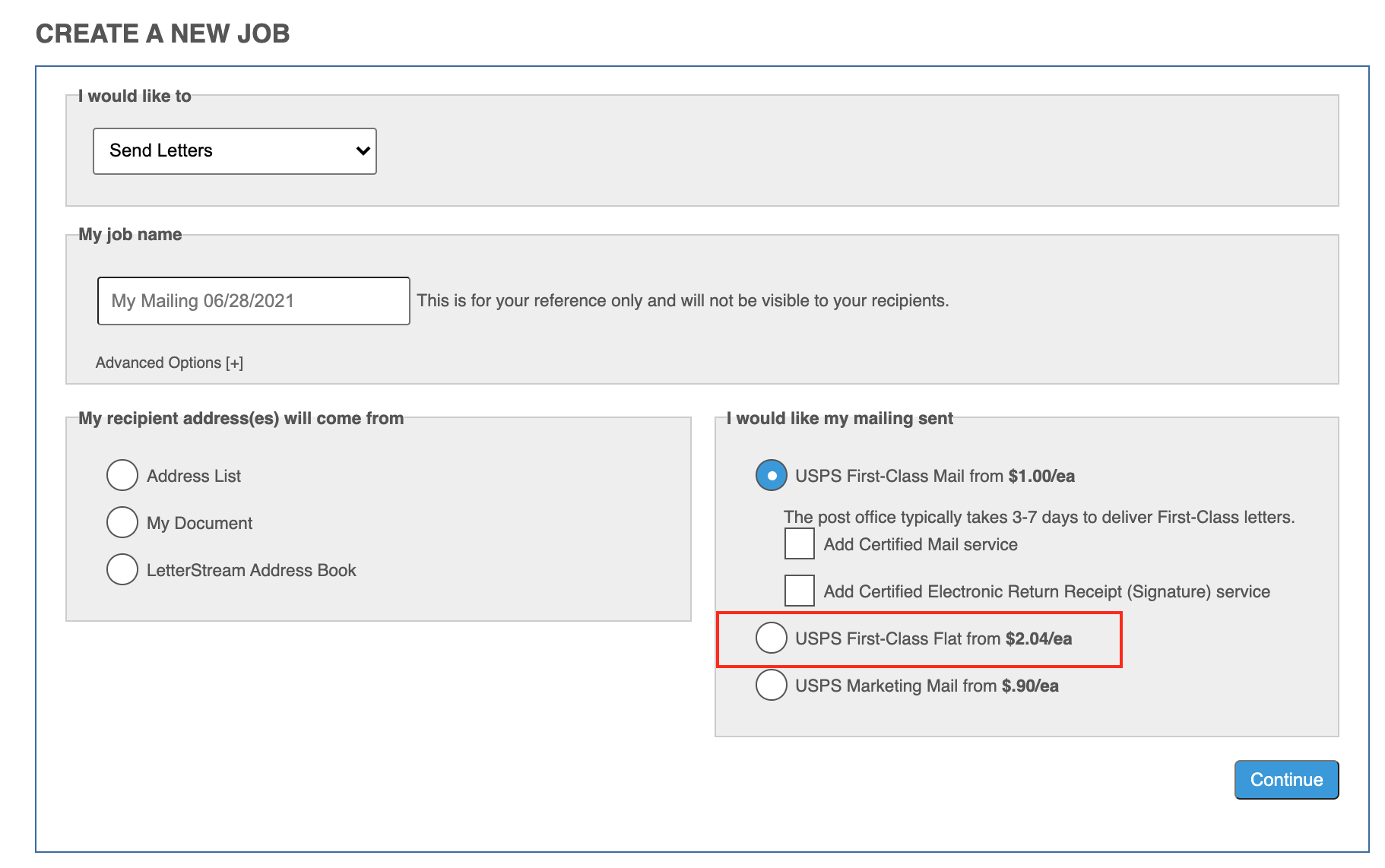 If you would like to staple pages together, you will need to select the large flat envelope option, which can be found by logging into your LetterStream account, clicking on Send Letter(s), and then clicking here: